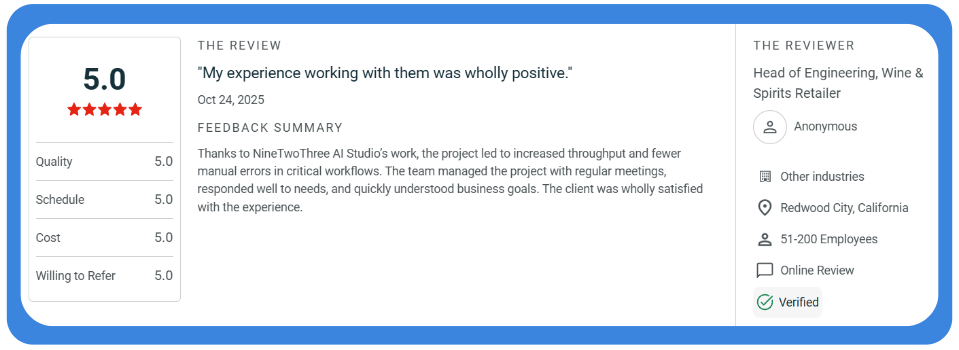 NineTwoThree is a Boston-based AI and ML studio with 13 years in business, 150+ projects delivered, and a team including ML engineers with backgrounds in deep learning, NLP, computer vision, and classical ML. We are SOC 2 and HIPAA certified, Inc. 5000 five years running, and have been ranked alongside Microsoft, NVIDIA, and IBM as a Top 50 AI consultancy by Clutch.