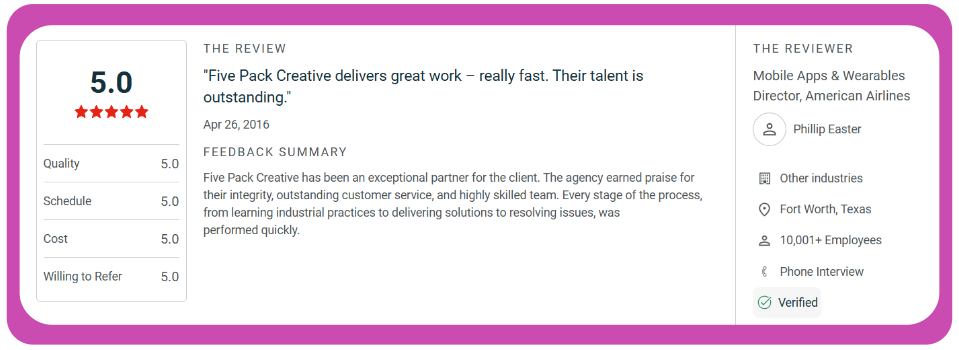 Based in Texas and Oklahoma, Five Pack Creative has spent 17 years building mobile and web applications for clients ranging from entrepreneurs to Fortune 500 companies. Their client roster includes American Airlines, Match.com, GoDaddy, and Engage2Learn.