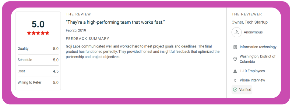 Since launching in 2014, Goji Labs has built 400+ digital products and helped clients raise over $1 billion in collective funding. Their approach combines product strategy consulting with design and development, which means they'll challenge your assumptions and validate your market hypotheses before writing code.